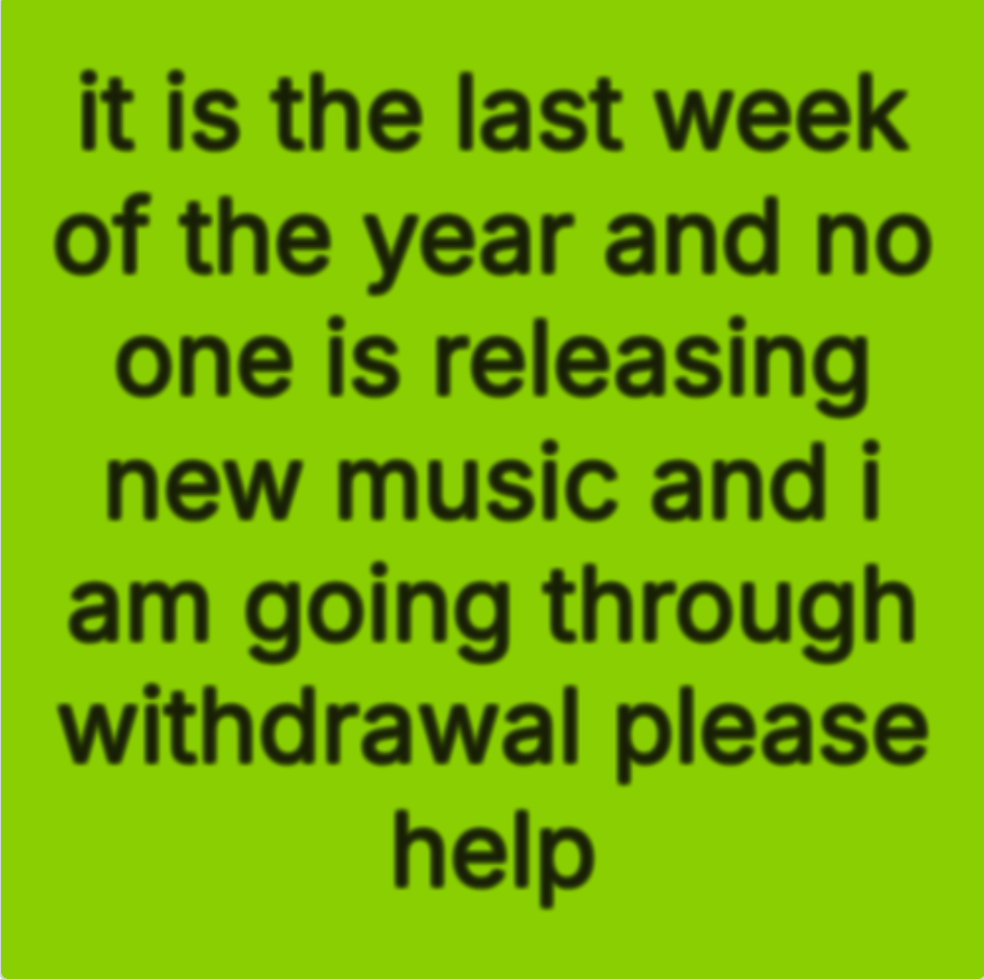 what’s up, friends. it’s the end of the year, which means it’s time to look back at the last 365 days and say “next year will be different.” as for myself, my theme for 2026 will be, and I quote, to “chill the fuck out.” this past year was a whirlwind, and while it was an absolute blast, i am in need of some quiet time to prepare for the next burst of activity that life inevitably has to offer.